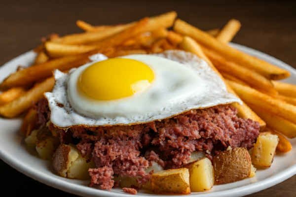 A hearty blend of crispy corned beef hash, perfectly seasoned and served with golden fries.