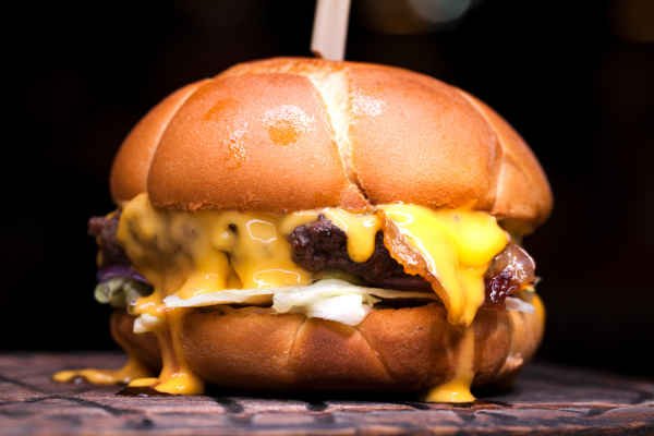 A juicy beef burger topped with melt cheese and served on a soft burger bun.