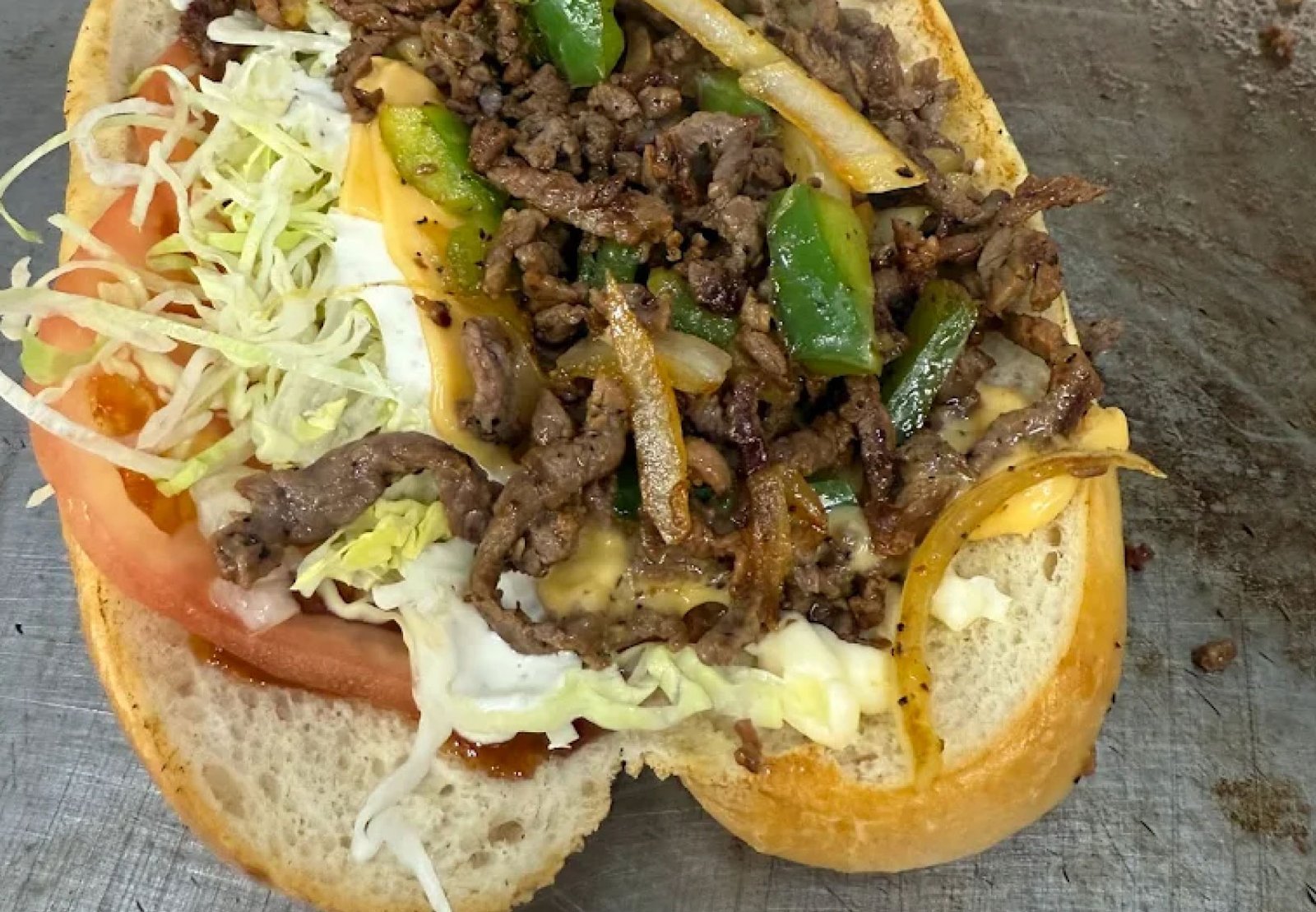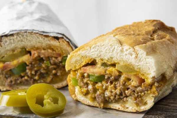 Seasoned ground beef with American cheese, peppers, onions, lettuce, tomato and mayo on toasted hero.